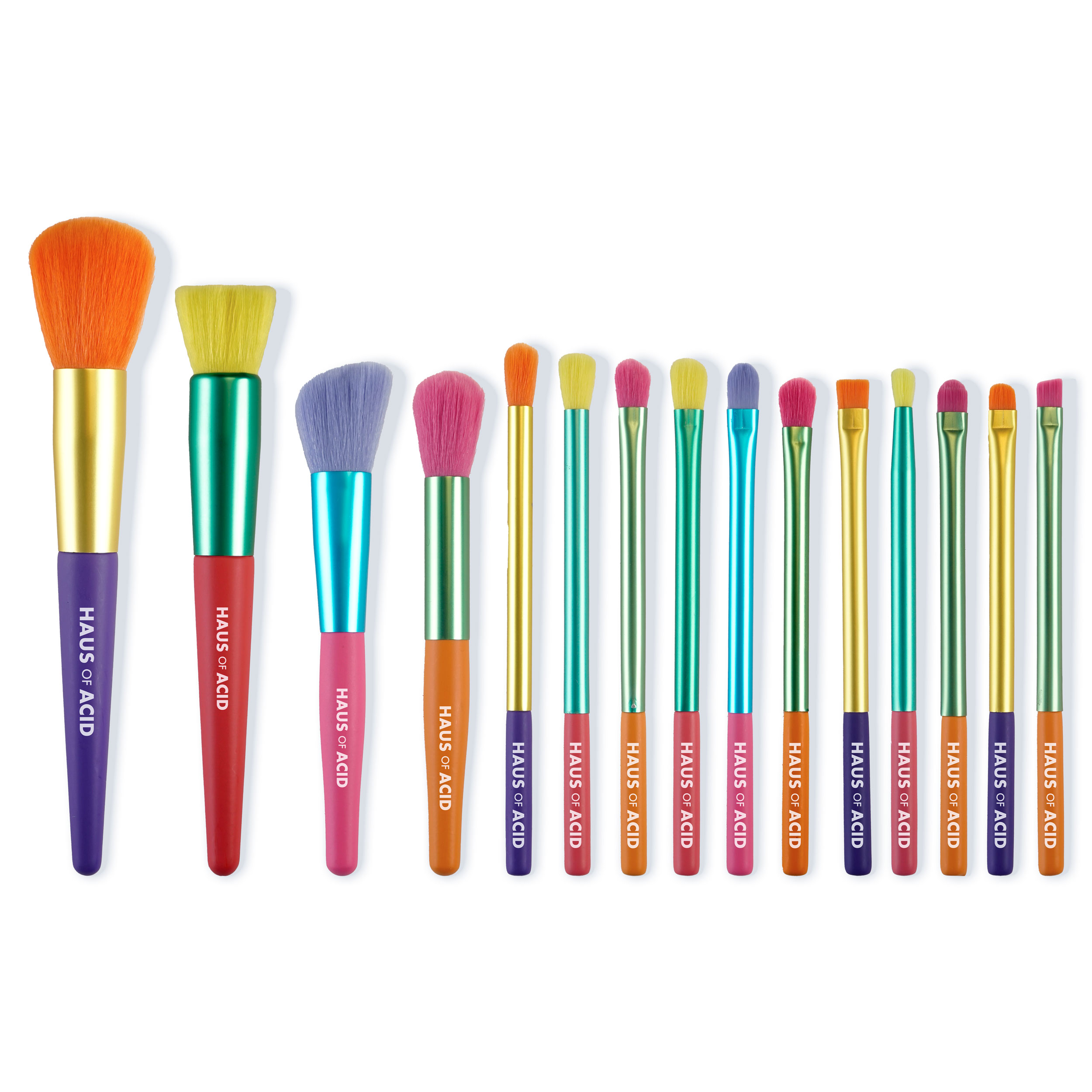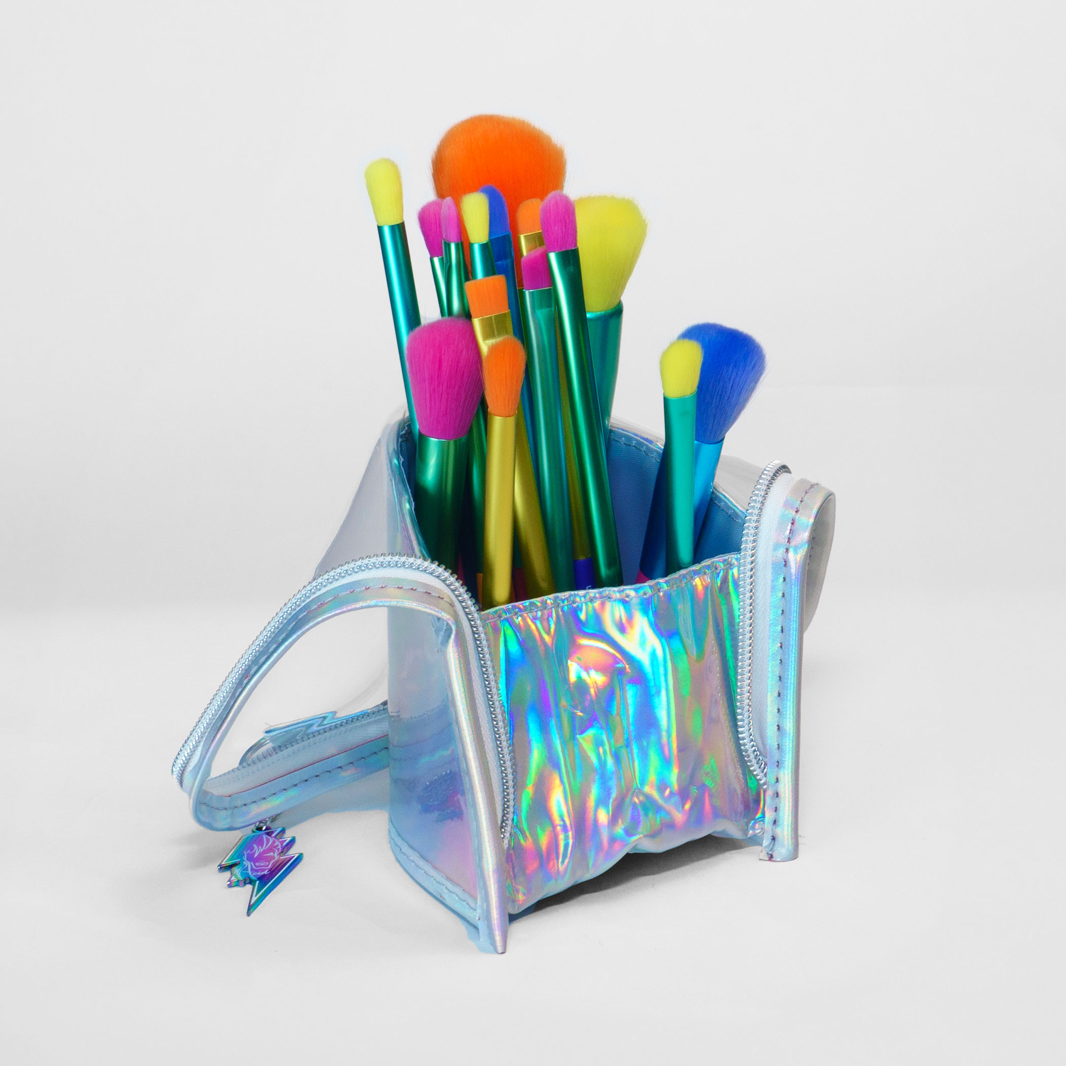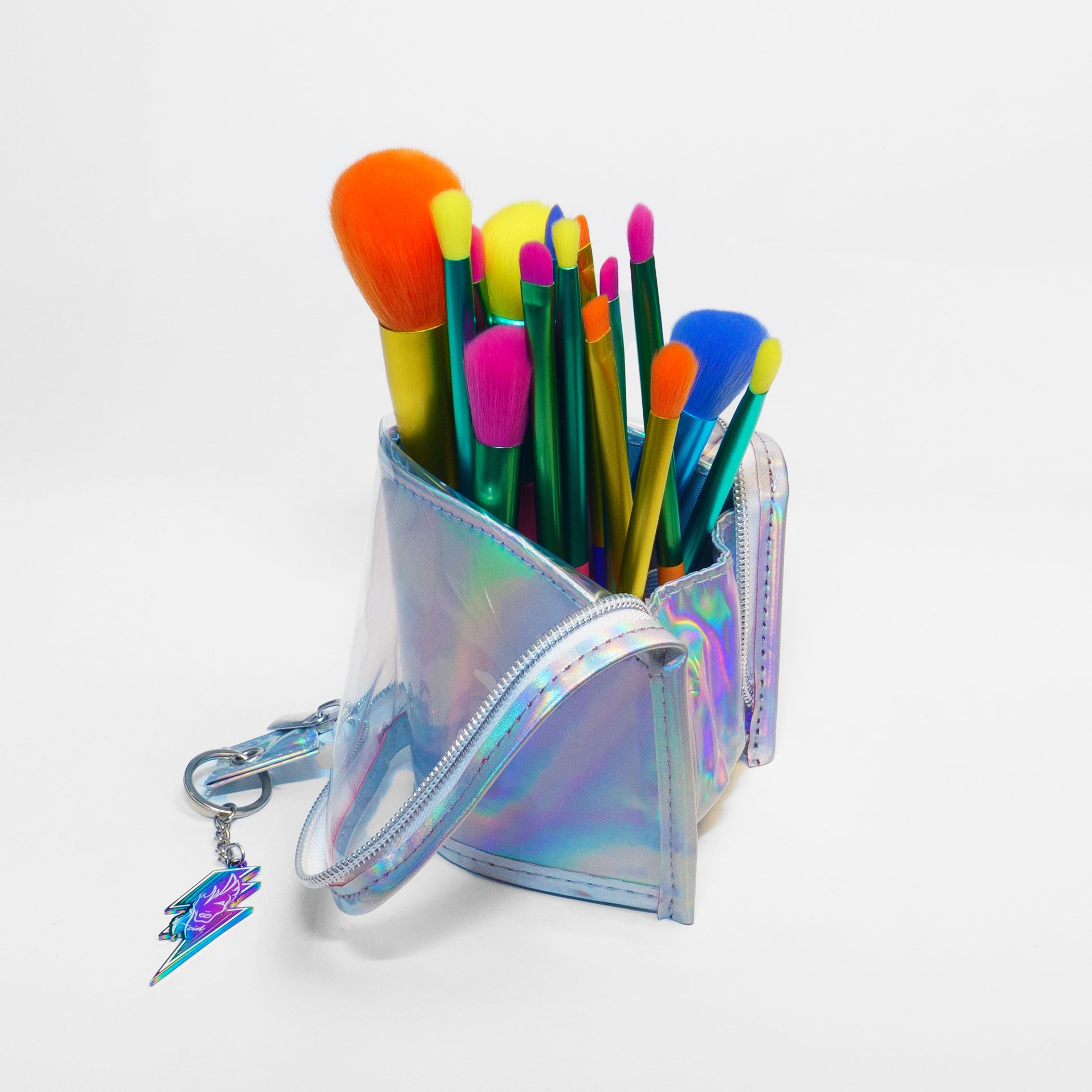 But wait, there’s more! Our set arrives in a jaw-dropping silver holographic case that’s not just a carrier for your 15 brushes; it transforms into an edgy upright holder, ensuring your brushes stay organized and ready for action, whether you’re hitting the stage or the streets. And to take things up a notch, we’ve included an exclusive rainbow alloy Haus of Acid keychain with our iconic logo charm – it’s not just a makeup journey; it’s a party in itself. Plus, it’s a handy spot to stash your keys if they tend to go rogue at the end of the night.